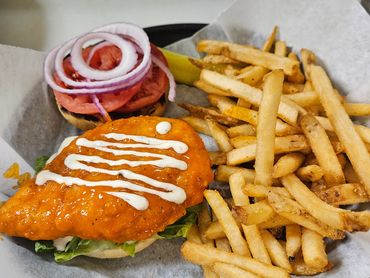 Grilled/Fried Chicken, tossed in buffalo sauce, lettuce, tomato, red onion. Choice of Ranch or Blue Cheese Dressing.